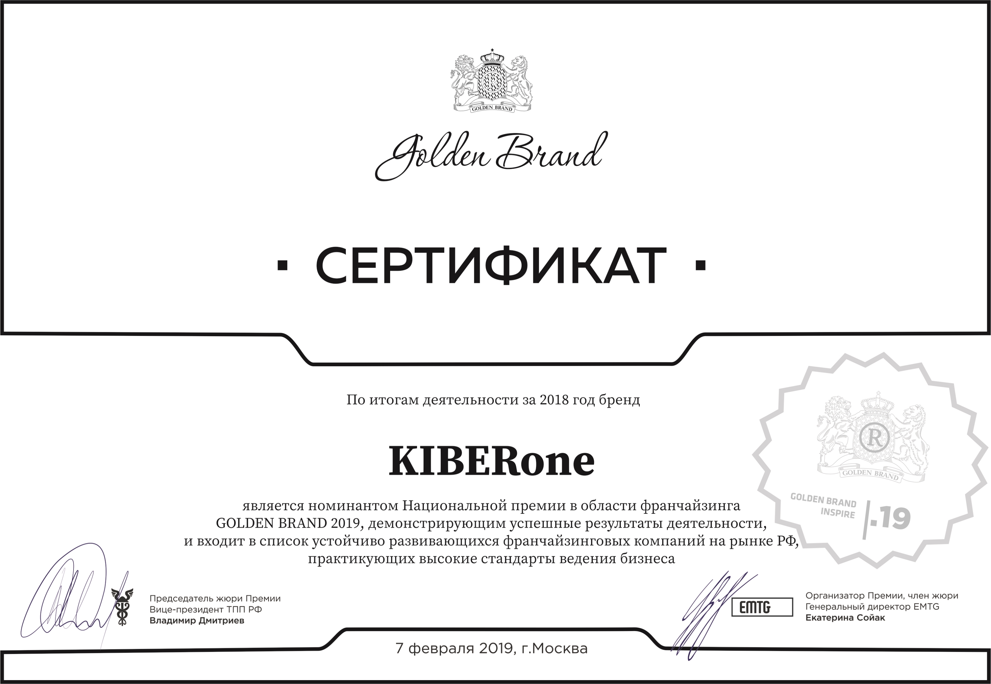 Нoминант «ПРОРЫВ ГОДА» в Национальной премии в области франчайзинга Golden Brand 2019.